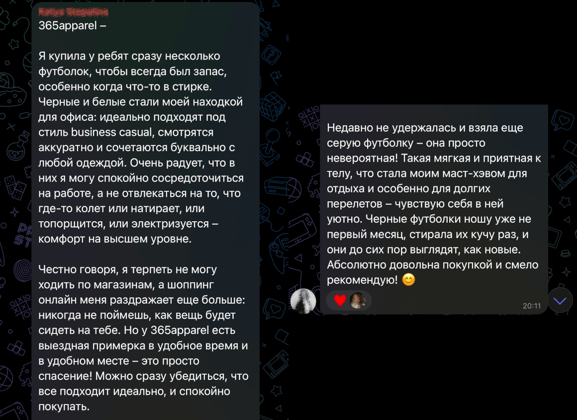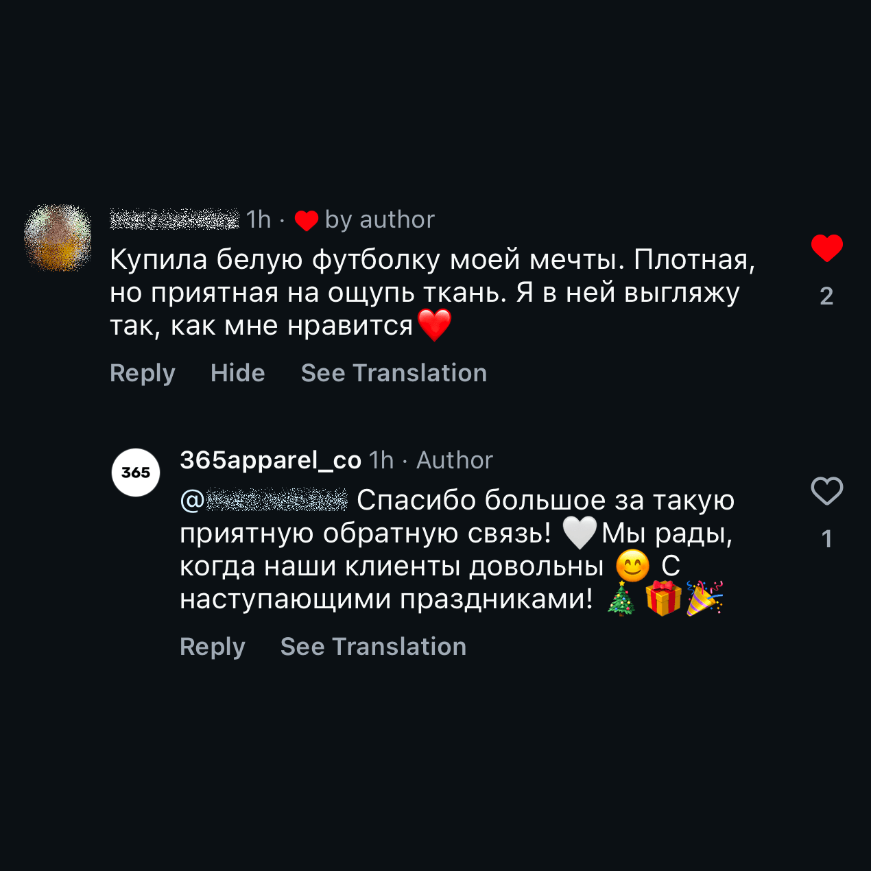 Я купила у ребят сразу несколько футболок, чтобы всегда был запас, особенно когда что-то в стирке. Черные и белые стали моей находкой для офиса: идеально подходят под стиль business casual, смотрятся аккуратно и сочетаются буквально с любой одеждой. Очень радует, что в них я могу спокойно сосредоточиться на работе, а не отвлекаться на то, что где-то колет или натирает, или топорщится, или электризуется — комфорт на высшем уровне. Честно говоря, я терпеть не могу ходить по магазинам, а шоппинг онлайн меня раздражает еще больше: никогда не поймешь, как вещь будет сидеть на тебе. Но у 365apparel есть выездная примерка в удобное время и в удобном месте — это просто спасение! Можно сразу убедиться, что все подходит идеально, и спокойно покупать. Недавно не удержалась и взяла еще серую футболку — она просто невероятная! Такая мягкая и приятная к телу, что стала моим маст-хэвом для отдыха и особенно для долгих перелетов — чувствую себя в ней уютно. Черные футболки ношу уже не первый месяц, стирала их кучу раз, и они до сих пор выглядят, как новые. Абсолютно довольна покупкой и смело рекомендую! ☺️
