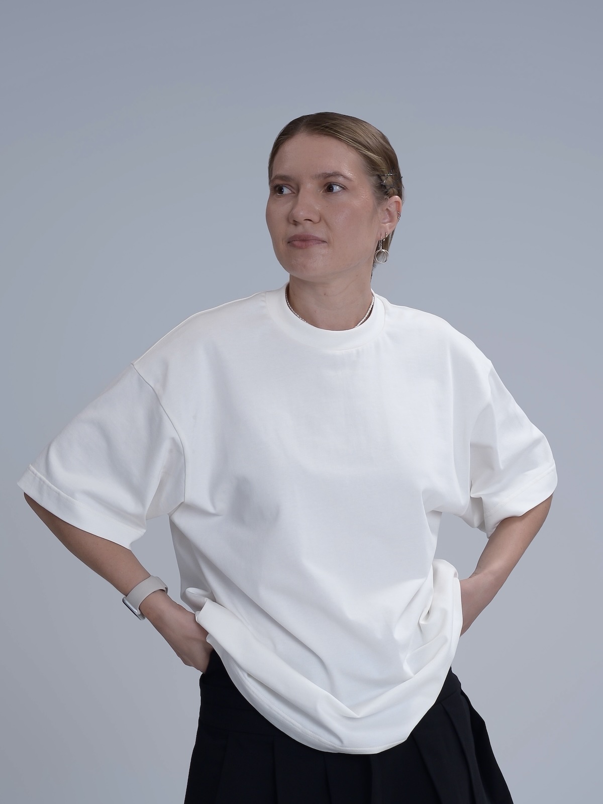 Базовый крой — более прилегающий, повторяет силуэт, но не обтягивает. Оверсайз — свободный, с чуть удлинёнными рукавами и заниженной линией плеча.
